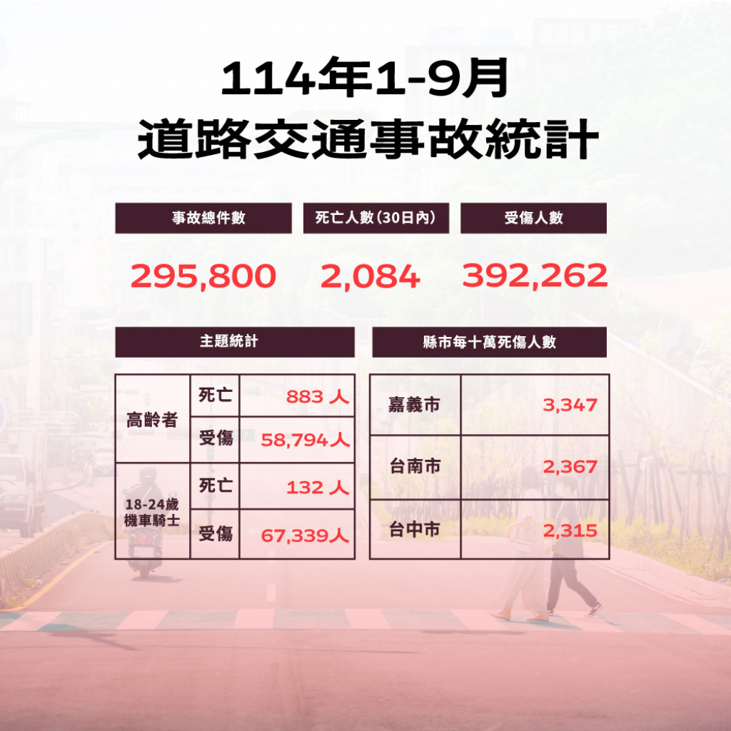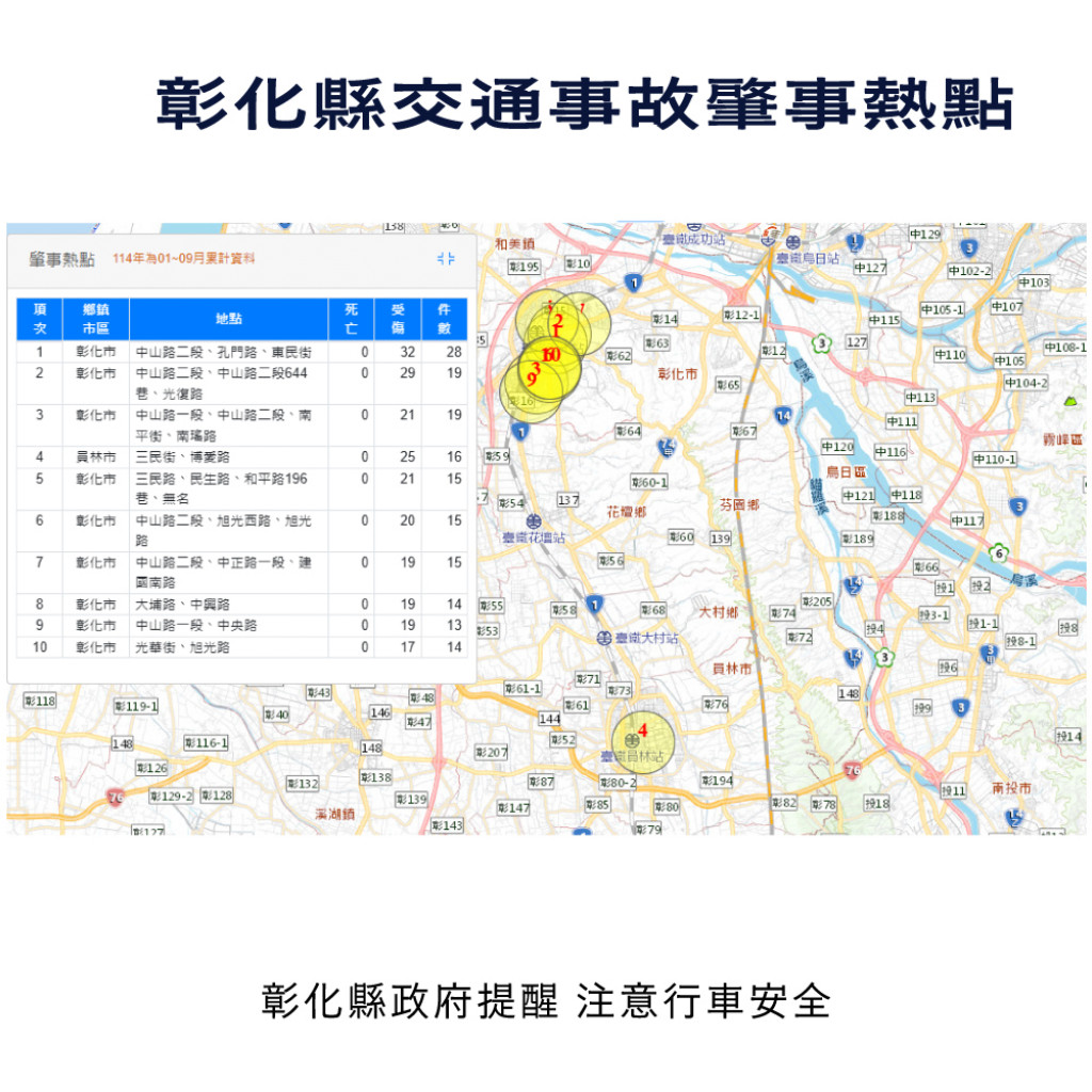 | 二、 | 根據交通部道安資訊查詢網,本縣114年1-9月道路交通事故與112年同期比較分析,以少年自行車騎士(含電自、電輔) 事故增加45%最高,外籍人士事故增加34.3%次之,自小客車駕駛人增加26%再次之。1-9月份鄉鎮市30日死亡人數於「彰化市、員林市、二林鎮」為多,肇事熱點以「彰化市」為多,合先敘明。 |