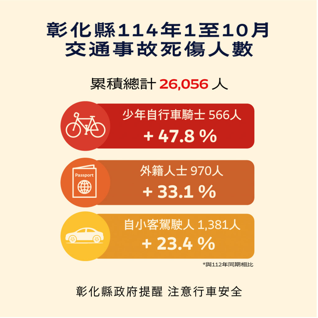 | 一、 | 根據交通部道安資訊查詢網,本縣114年1-10月道路交通事故與112年同期比較分析,以少年自行車騎士(含電自、電輔) 事故增加47.8%最高,外籍人士事故增加33.1%次之,自小客車駕駛人增加23.4%再次之。1-10月份鄉鎮市30日死亡人數於「彰化市、員林市、二林鎮、鹿港鎮」為多,肇事熱點以「彰化市」為多,合先敘明。 |
