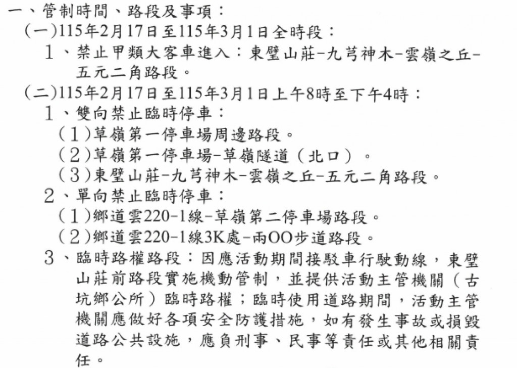 公告部分路段禁止車輛進入、