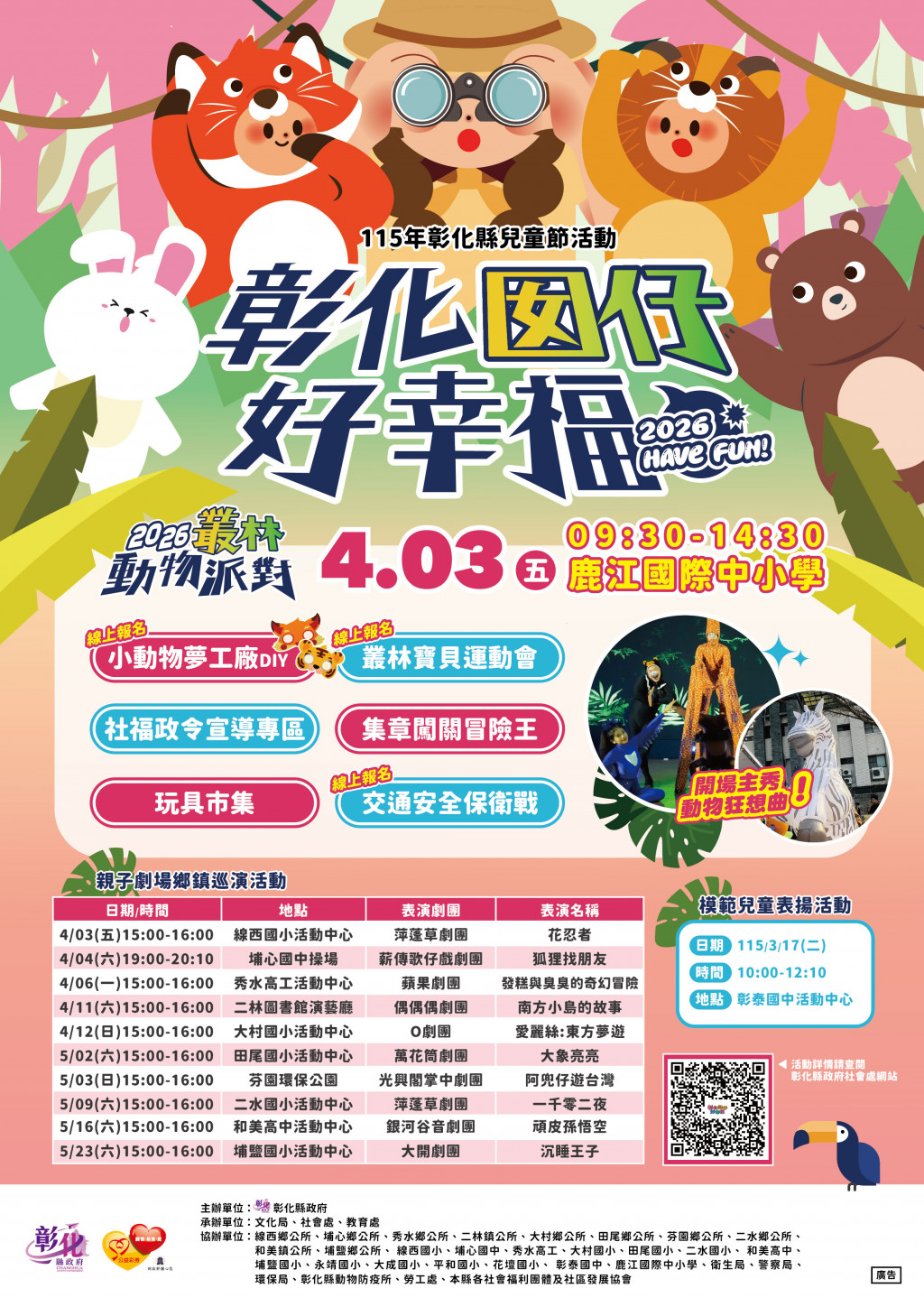 活動訊息請至本府社會處網站/活動訊息專區/彰化囡仔好幸福~115年彰化縣兒童節活動「2026叢林動物派對」(網址:https://reurl.cc/ZZRY8a)參閱。 |