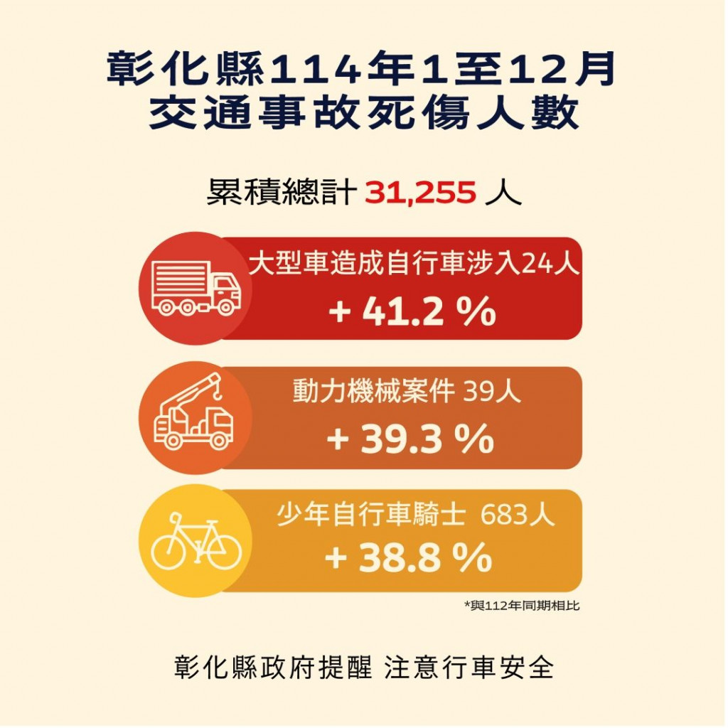 | 一、 | 根據交通部道安資訊查詢網,本縣114年1-12月道路交通事故與112年同期比較分析,以大型車造成自行車涉入(含電自、電輔)事故增加41.2%最高, 動力機械案件 增加39.3%次之。少年自行車騎士(含電自、電輔) 增加38.8%再次之。1-12月份鄉鎮市30日死亡人數於「彰化市、員林市、鹿港鎮」為多,肇事熱點以「彰化市」為多,合先敘明。 |