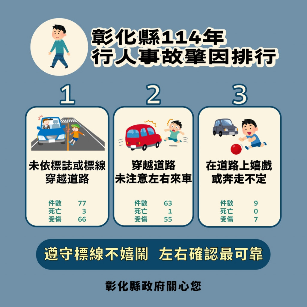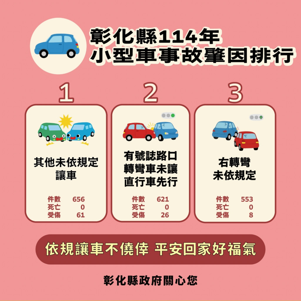 | 二、 | 依據交通部道路安全資訊平台系統分析數據,114年彰化縣事故肇因排行: |