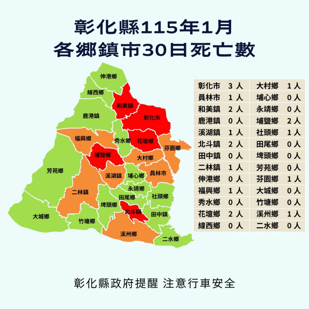 | 二、 | 根據交通部道安資訊查詢網,本縣115年1月道路交通事故與去(114)年同期比較分析,以大型車造成行人涉入事故增加100%最高,少年自行車騎士(含電自、電輔) 增加67.4 %次之。微型電動二輪車(含電輔) 增加48.8 %再次之。1月份鄉鎮市30日死亡人數於「彰化市、和美鎮、北斗鎮、花壇鄉、埔鹽鄉」為多,肇事熱點以「彰化市」為多。 |